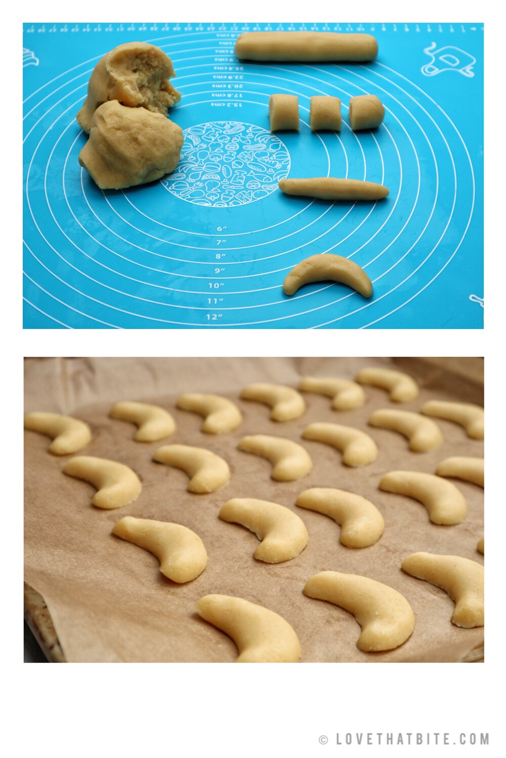 • Divide the dough into several parts. Roll each section of dough into logs approximately 1,5 cm thick. Cut the logs into 2 cm pieces, and bend the pieces into a crescent shape. Or you can use Vanillekipferl form to make all the cookies have the same size.